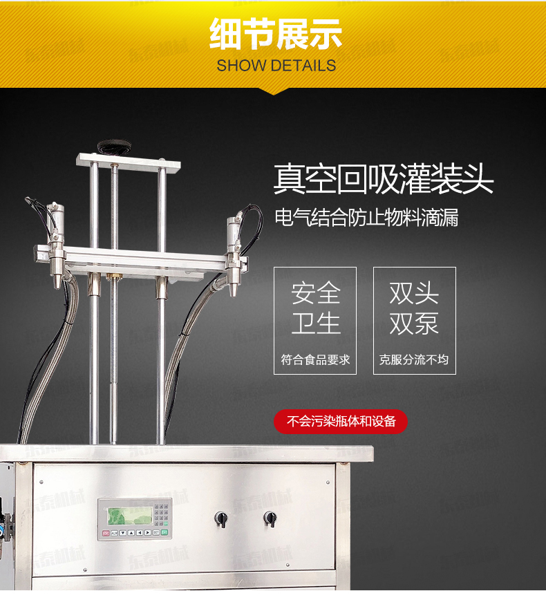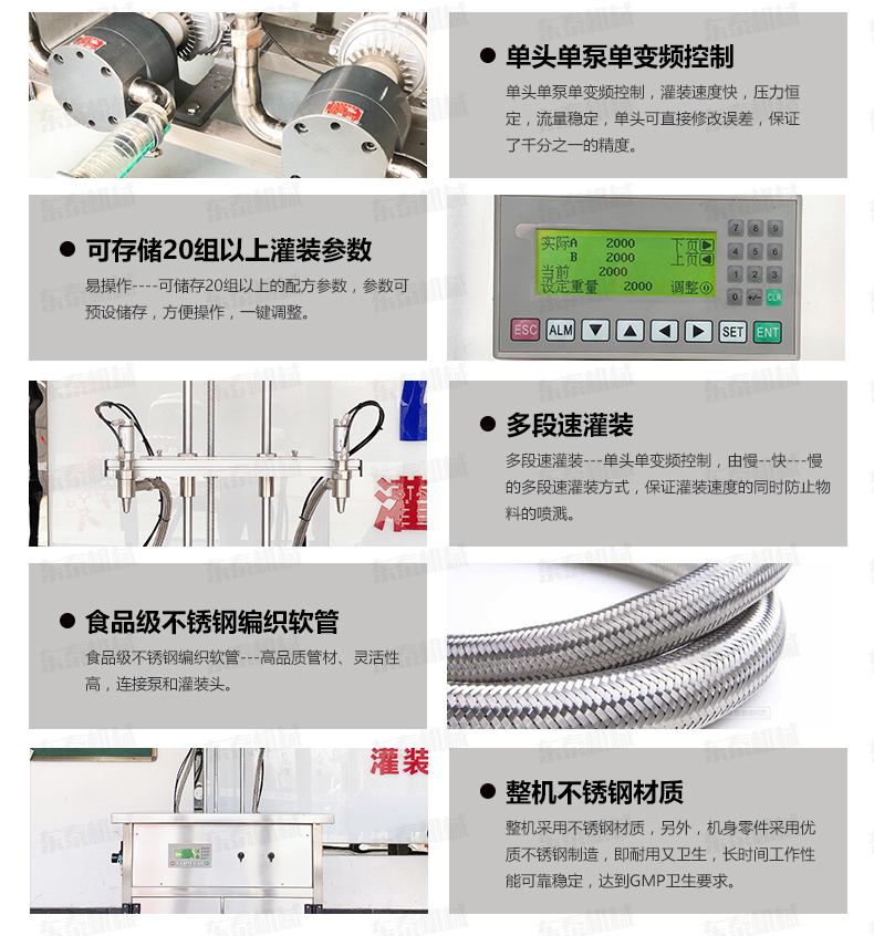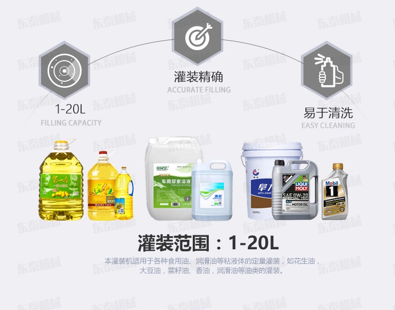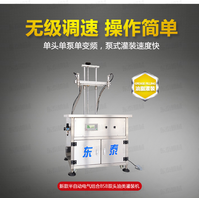 半自動(dòng)食用油灌裝機(jī)設(shè)備介紹 半自動(dòng)食用油灌裝機(jī)適用于各種食用油、潤滑油等粘液體的定量灌裝,如花生油,大豆油,菜籽油、香油,潤滑油等油類的灌裝。采用先進(jìn)的定量灌裝技術(shù),結(jié)合微電子智能控制技術(shù)單頭單變頻