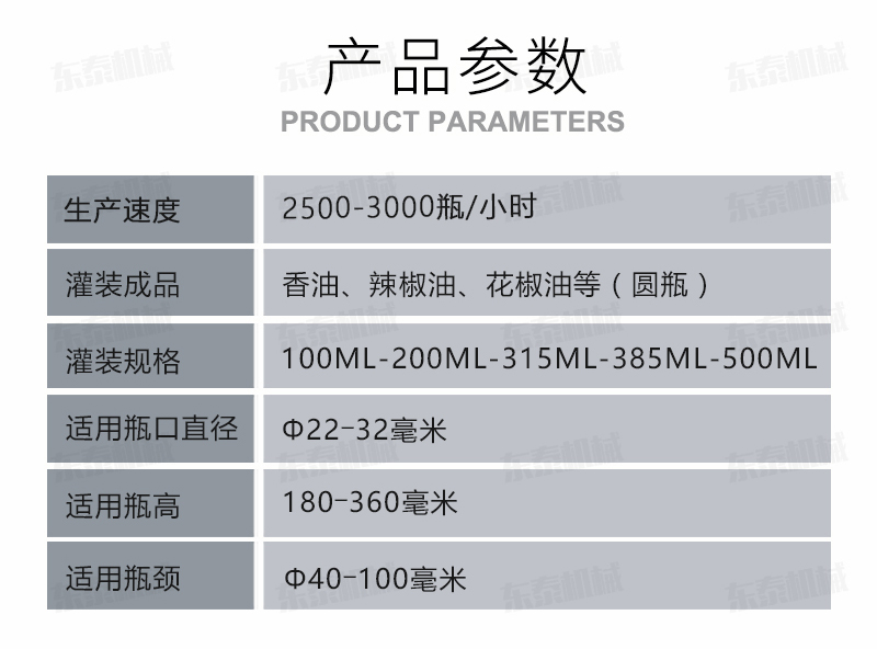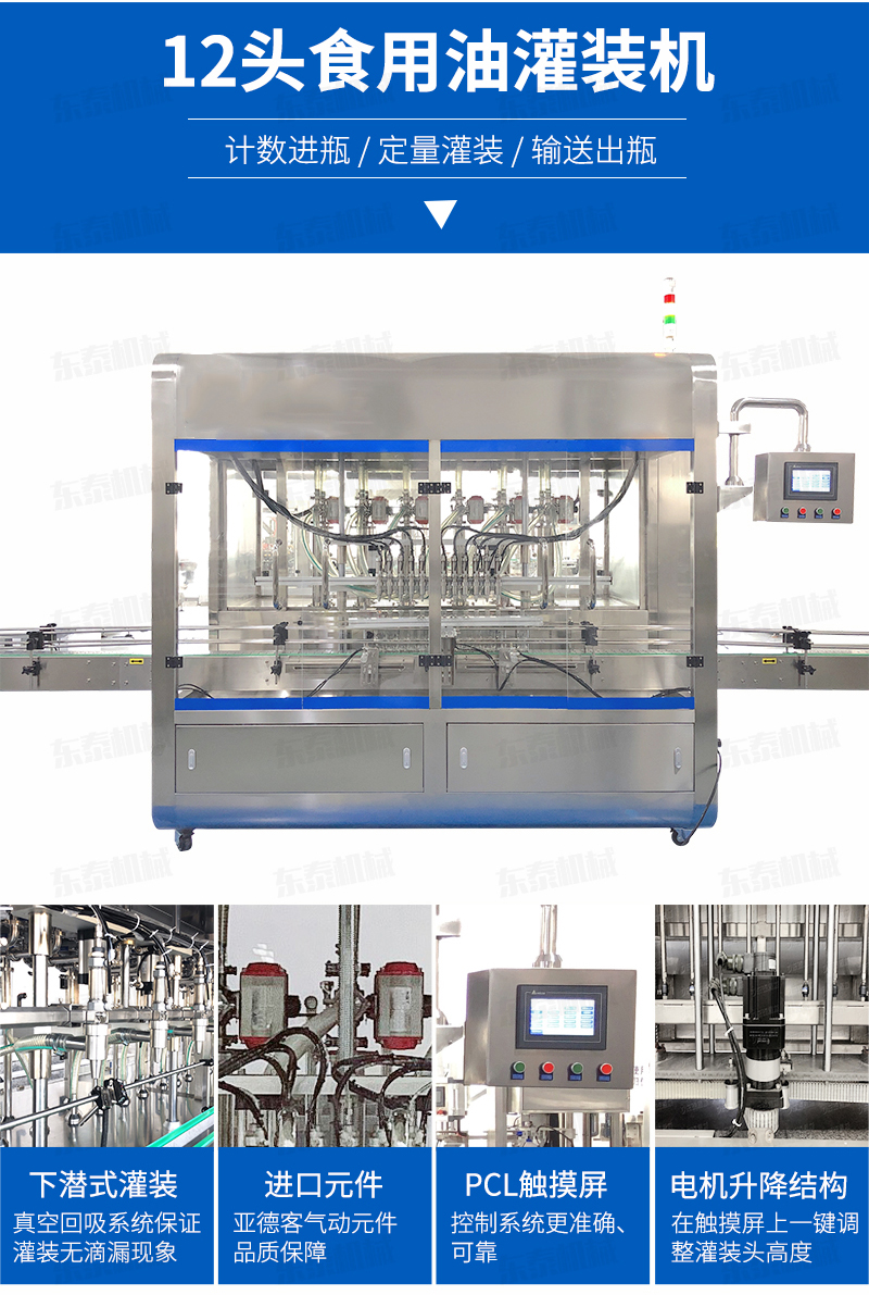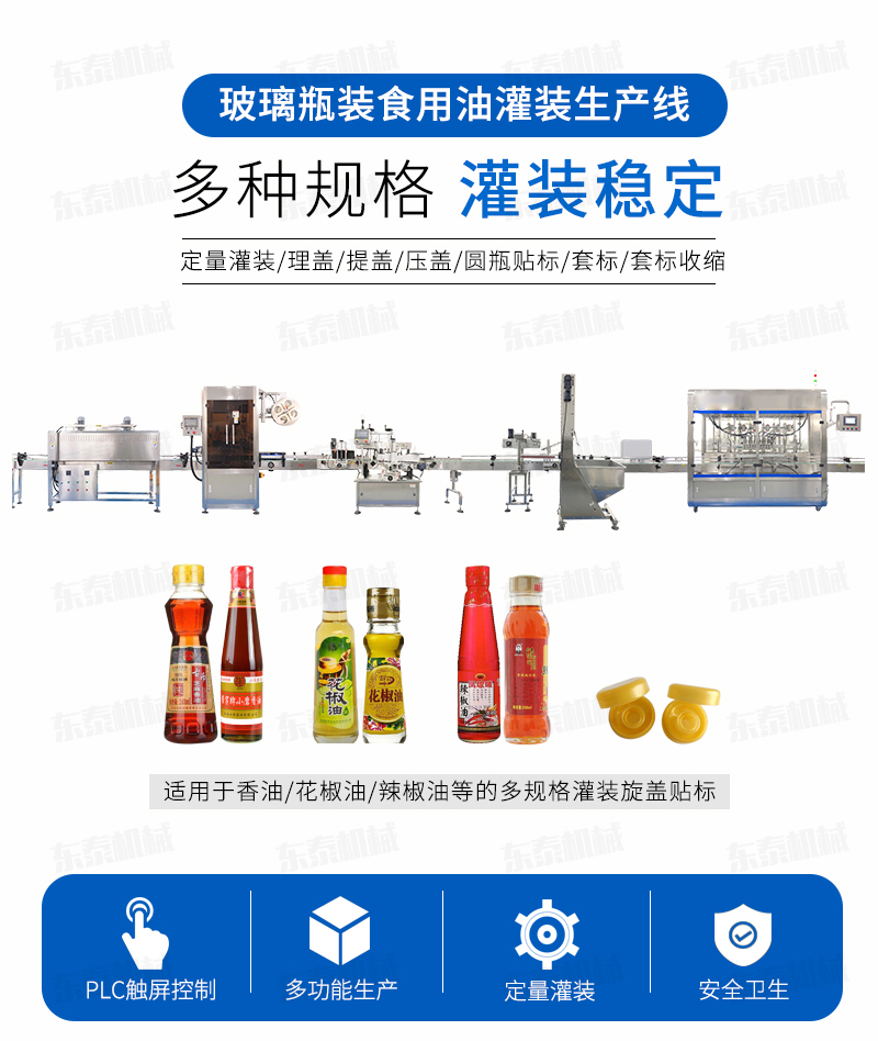 灌裝機(jī)簡述 該系列灌裝機(jī)采用容積式計(jì)量灌裝原理,適用于各種規(guī)(100ml-1000ml)的南瓜籽油、榛子油、牡丹籽油、芝麻油、核桃油、山茶油、亞麻籽油、棉籽油、橄欖油、大豆油、玉米油