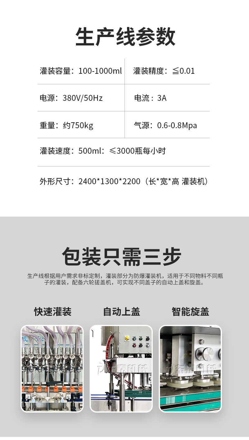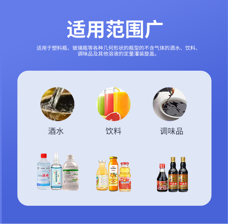電子量杯感應直列式灌裝機,是目前國內(nèi)液體灌裝的高端產(chǎn)品,自動化程度高,灌裝計量精確,適用于塑料瓶、玻璃瓶等各種幾何形狀的瓶型的不含氣體的酒水、飲料、調(diào)味品及其他溶液的定量灌裝。機器采用觸摸