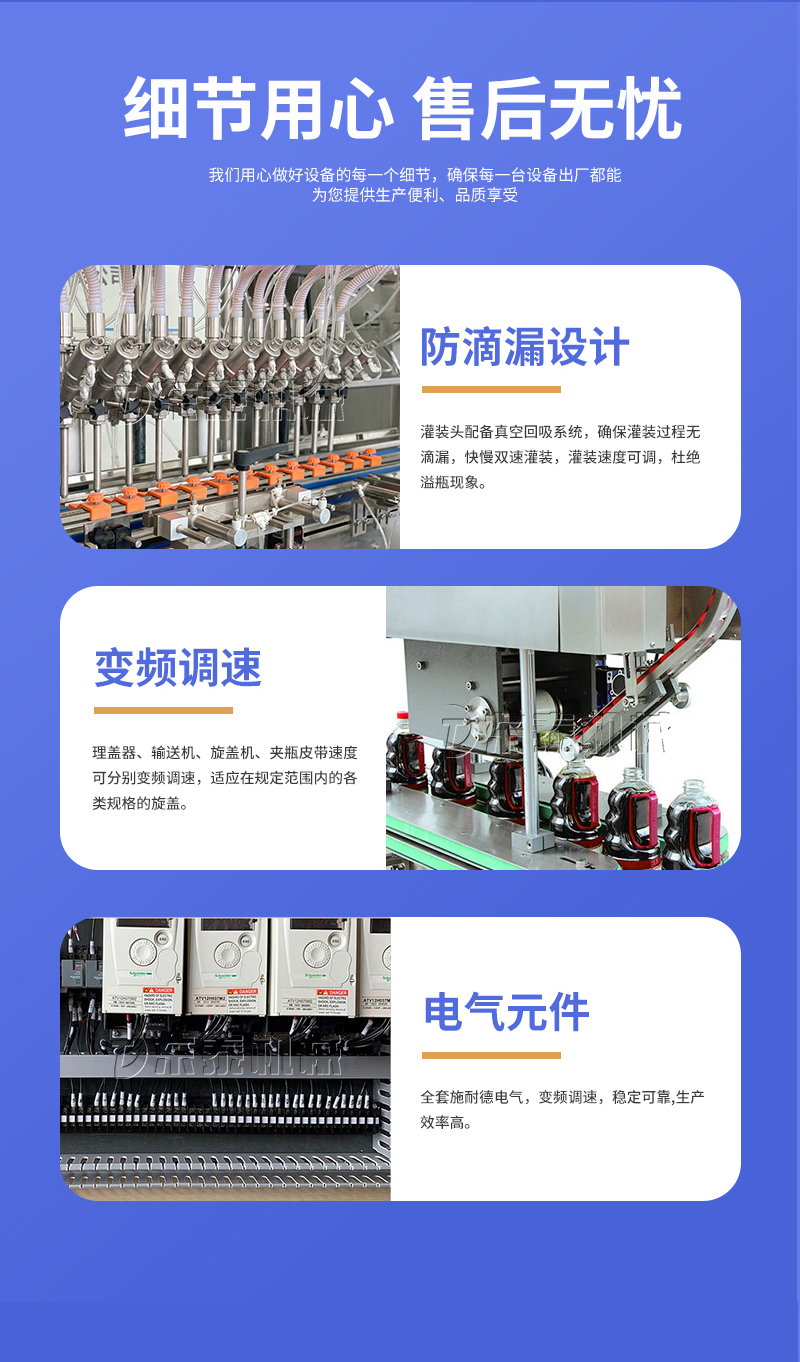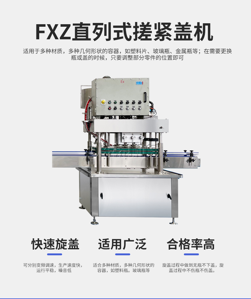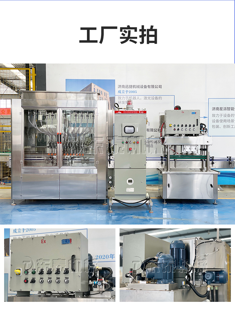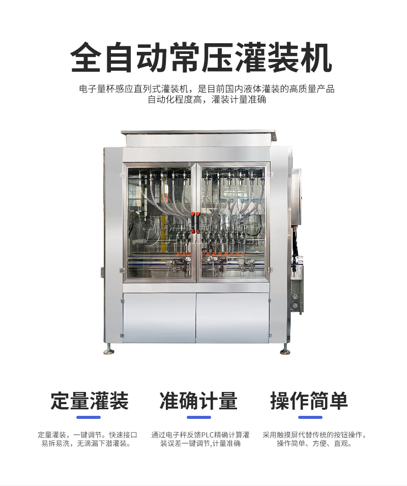 電子量杯感應直列式灌裝機,是目前國內(nèi)液體灌裝的高端產(chǎn)品,自動化程度高,灌裝計量精確,適用于塑料瓶、玻璃瓶等各種幾何形狀的瓶型的不含氣體的酒水、飲料、調(diào)味品及其他溶液的定量灌裝。機器采用觸摸屏代替?zhèn)鹘y(tǒng)的按鈕操作,操作簡單、方便、直觀?萍己扛。機器灌裝計量可通過觸摸屏對灌裝時間的調(diào)整實現(xiàn)不同計量灌裝,方便操作者使用。