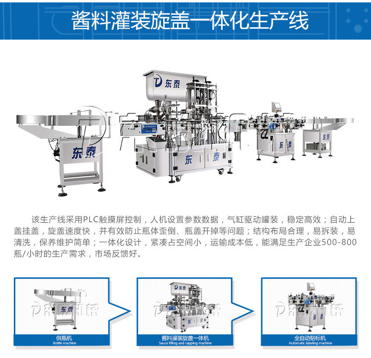 自動化醬料灌裝機是專業(yè)根據(jù)辣椒醬、豆瓣醬、牛肉醬、芝麻醬、香菇醬、蝦醬等醬類所研發(fā)設計的,市場上這么多的商品都是要經(jīng)過包裝之后才能流通的,因此自動化醬料灌裝機成為了現(xiàn)代化社會生產(chǎn)的新技術,其經(jīng)過我們東泰多年的科技成果不斷改進適用廣泛,在自動化方面等等更是十分的人性化,當前可以從各行業(yè)的產(chǎn)品生產(chǎn)來看都是可以選擇自動化醬料灌裝機來進行包裝的,該機依靠著我們東泰專業(yè)的技能占據(jù)著整個行業(yè)的重位,從而更好的滿足人們的消費觀念